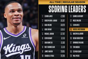 这样威少生涯总得分已经超越奥拉朱旺,(26946分),历史得分榜排名将上升至第14位,下一个将追逐埃尔文·海耶斯(27313)。