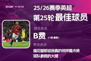 在曼联2-0热刺的比赛中,B费大师级表现串联全队,还打入关键进球,达成曼联生涯参与200球里程碑,率领红魔豪取4连胜,一记风骚插花脚更是引得吧友直呼“魔术师”!B费获得吧友52542票,高票当选【体育资讯X咪咕体育英超第25轮最佳球员】!