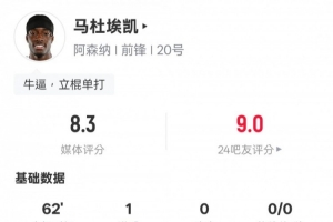 体育资讯2月16日讯 足总杯第4轮,阿森纳主场迎战维冈竞技。马杜埃凯首发出战,打进1粒进球,送出4次关键传球,3次过人成功,评分8.3。