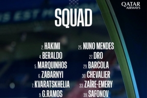后卫:2-阿什拉夫、4-贝拉尔多、5-马尔基尼奥斯、6-扎巴尔尼、21-卢卡斯·埃尔南德斯、25-努诺·门德斯、51-威廉·帕乔