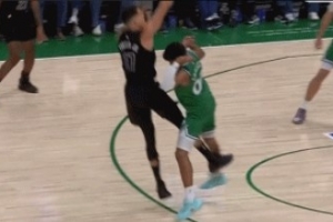 波杰姆飞天抢板坐着OG下落 不慎踢到后者鼻子 回看后未升级