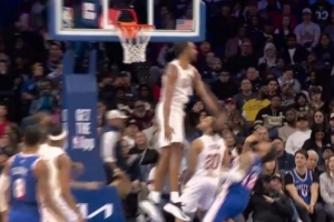 看着很疼!波杰姆斯基追防被唐斯肘扫到面部倒地 吹后者进攻犯规